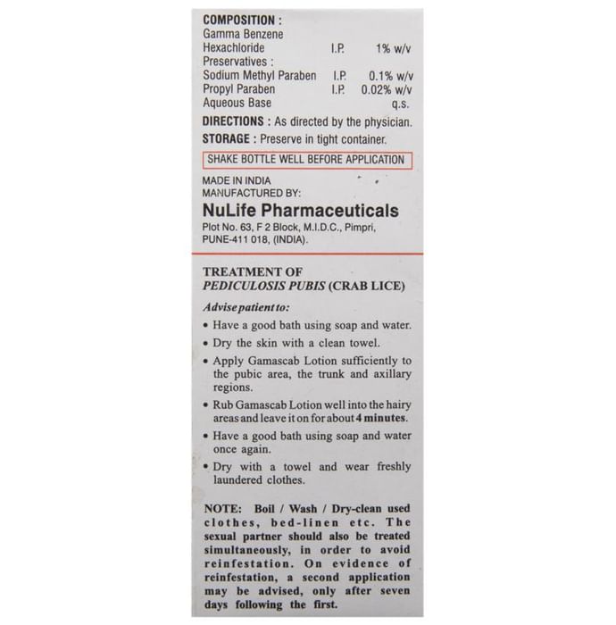 Gamascab Lotion is an antiparasitic medicines. It works by killing the tiny insects (mites) and their eggs, which cause scabies.