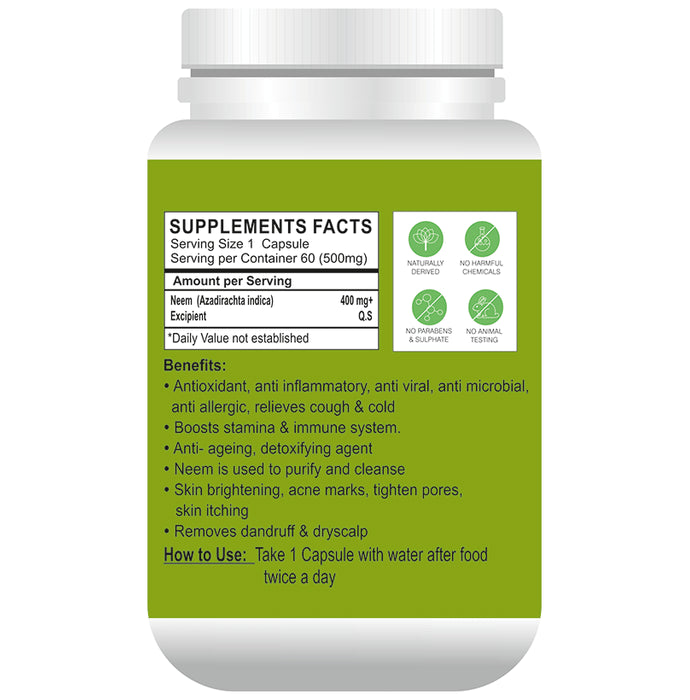 Key Ingredients of Globyherbs Neem Capsule:NeemKey Benefits of Globyherbs Neem Capsule:Contains antioxidant, anti-inflammatory, anti-viral and anti-microbial propertiesRelieves cough and coldBoosts the immune systemHas anti-ageing benefitsBrightens the skinFades acne marks and tightens poresHelps maintain scalp health