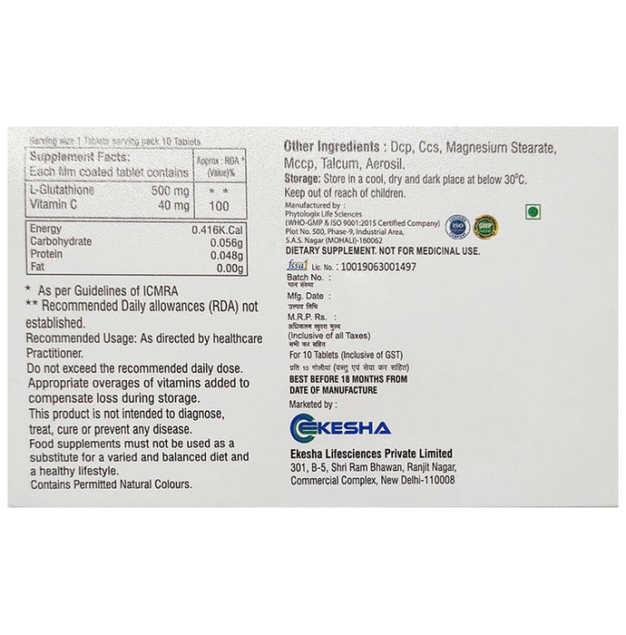 Glut-C Tablet is a dietary supplement with the goodness of vitamin C and L-glutathione. It is rich in antioxidant properties that neutralise free radicals. The formulation helps to boost immunity and supports overall wellness. It helps to detoxify the body and remove toxins before they get absorbed. It promotes optimal cell function and healthy ageing. L-Glutathione nourishes the skin and helps reduce dark spots, pigmentation, suntan, dark circles and post-acne black spots.