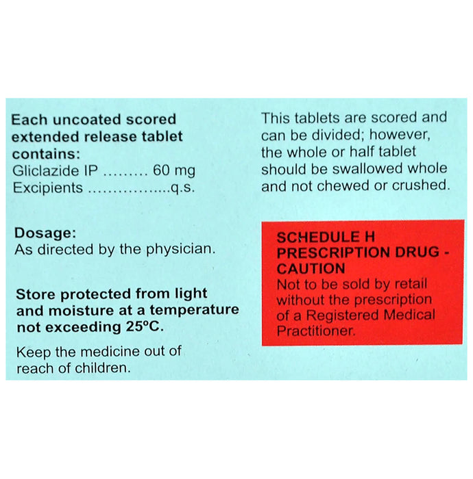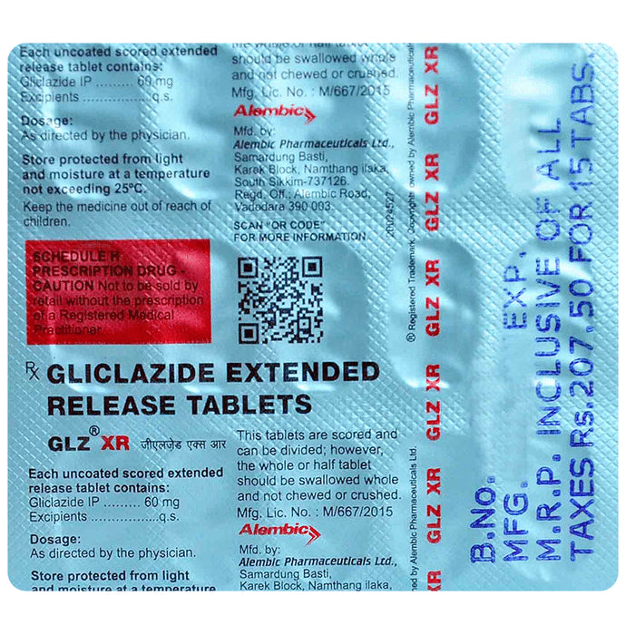 Glz XR Tablet is a medicine used to treat type 2 diabetes mellitus in adults. It belongs to a group of medicines called sulfonylureas and helps control blood sugar levels in people with diabetes. This helps to prevent serious complications of diabetes like kidney damage and blindness. Glz XR Tablet may be prescribed alone or along with other medicines. It should be taken with food. Take it regularly at the same time each day to get the most benefit. Your doctor will decide what dose is best for you and this may change from time to time according to how it works.Keep taking this medicine, even if you feel well or your blood sugar levels are controlled. If you stop it without consulting your doctor, your blood sugar levels could rise and put you at risk of kidney damage, blindness, nerve problems, and loss of limbs. Remember that it is only part of a treatment program that should also include a healthy diet, regular exercise, and weight reduction as advised by your doctor. Your lifestyle plays a big part in controlling diabetes.The most common side effects of taking this medicine include indigestion and stomach upsets. It can also cause low blood glucose levels (hypoglycemia). Make sure you recognize the signs of having low blood glucose levels, such as sweating, dizziness, headache, and shaking, and know how to deal with it. To prevent this, it's important to have regular meals and always carry a fast-acting source of glucose such as sugary food or fruit juice with you. Drinking alcohol can also increase your risk of low blood sugar levels and should be avoided. Some people may find that they put on weight with this medicine.You should not take it if you have type 1 diabetes mellitus, if you have diabetic ketoacidosis (high levels of acid in your blood), or if you have severe kidney or liver disease. Before taking this medicine, tell your doctor if you have ever had heart disease, thyroid disease, or some hormonal conditions. It may not be suitable. Pregnant or breastfeeding women should also consult their doctor before taking it. Your blood sugar levels should be checked regularly and your doctor may also advise blood tests to monitor your blood cell counts and liver function.