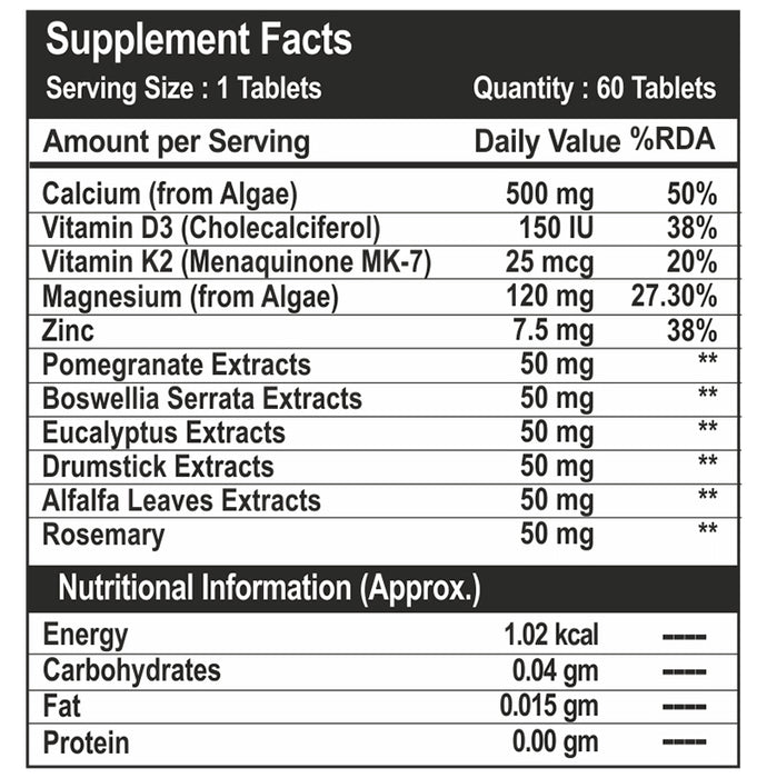 Composition : Calcium,Vitamin D3,Vitamin K2,Zinc,Pomegranate Extract,Boswellia Serrata Extract,Eucalyptus Extract,Drum Stick Extract