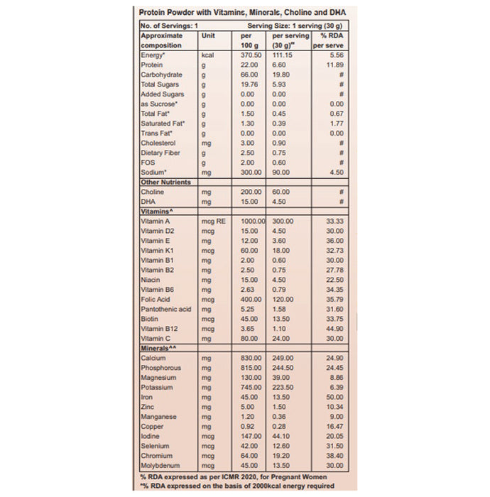 Composition : Other nutrients: Choline, DHA|Vitamins: Vitamin A, D2, E, K1, B1, B2, Niacin, Vitamin B6, Folic Acid, Pantothenic acid, Biotin, Vitamin B12, Vitamin C|Minerals: Calcium, Phosphorous, Magnesium, Potassium, Iron, Zinc, Manganese, Copper, lodine, Selenium, Chromium, Molybdenum