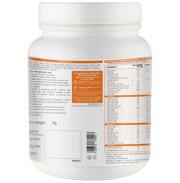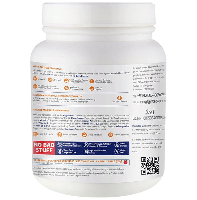 Gritzo SuperMilk Height+, 7-12y Boys with Super Gummies (Double Chocolate, 1kg and Strawberry, 30 Gummies) (Combo Pack)Gritzo SuperMilk Height+ for 7-12 Year Boys promotes natural height growth. This kids’ protein powder provides 10g of high-quality protein per 33.3g serving to fulfil the daily protein gap. It is enriched with 100% RDA of Vitamin D3 (3X more efficient than D2), which leads to higher absorption of calcium in the body, and 21 essential vitamins and minerals with electrolytes for optimal growth and development. This nutrition powder for kids also contains ingredients like Ashwagandha, 100% RDA of Zinc, Colostrum, and Magnesium for height growth in 7-12 yr boys. Gritzo SuperMilk is one of the best vegetarian sources of protein for kids. It doesn’t contain any soy protein, refined sugars, preservatives, colours, artificial flavours, gluten or malt. This immunity booster for kids is available in a 100% natural double chocolate flavour.Note: Growth and development are influenced by genetic, nutrition and environmental factors. Product is to be taken as a part of a daily balanced diet and with regular exercise.