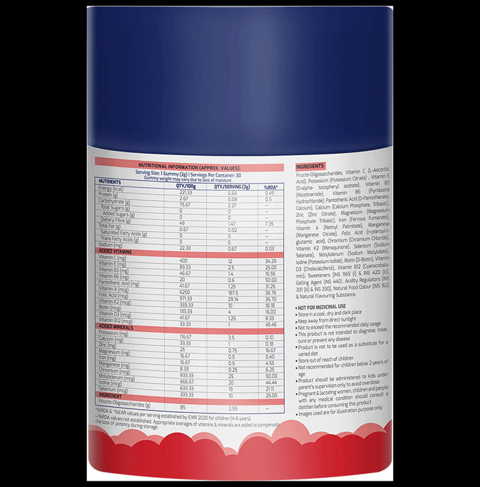 Composition : Fructo-Oligosaccharides 85mg, Vitamin C (L-Ascorbic Acid) 12mg, Potassium (Potassium Citrate) 35mg, Vitamin E (D-alpha Tocopheryl Acetate) 2.5mg, Vitamin B3 (Nicotinamide) 1.4mg, Vitamin B6 (Pyridoxine Hydrochloride) 0.6mg, Pantothenic Acid (D-Pantothenate Calcium) 1.25mg, Calcium (Calcium Phosphate, Tribasic) 1mg, Zinc (Zinc Citrate) 0.75mg, Magnesium (Magnesium Phosphate, Tribasic) 0.5mg, Iron (Ferrous Fumarate) 0.5mg, Vitamin A (Retinyl Palmitate) 125mcg, Manganese (Manganese Citrate) 0.25mg, Folic Acid (n-pteroyl glutamic acid) 36mcg, Chromium (Chromium Chloride) 0.025mg, Vitamin K2 (Menaquinone) 0.025mg, Selenium (Sodium Selenate) 0.019mg, Molybdenum (Sodium Molybdate) 0.025mg, Iodine (Potassium Iodide) 0.02mg, Biotin (D-Biotin) 4mcg, Vitamin D3 (Cholecalciferol) 1.25mcg, Vitamin B12 (Cyanocobalamin) 0.01mg.. Sweeteners (INS 965 (1) & INS 420 (11)). Gelling Agent (INS 440). Acidity Regulators [INS 331 (iii) & INS 330). Natural Food Colour (INS 162) & Natural Flavouring Substance.