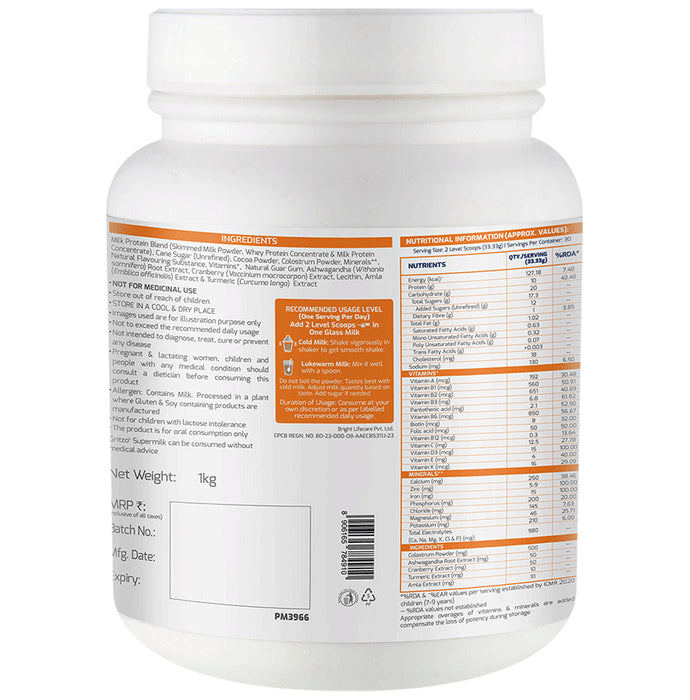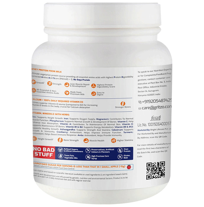 Gritzo SuperMilk Height+, 7-12y Girls with Super Gummies (Double Chocolate, 1kg and Strawberry, 30 Gummies) (Combo Pack)Gritzo SuperMilk Height+ for 7-12 year girls comes with 10g of high-quality protein in each serving of 33.3g and fills the daily protein gap. In addition, it is enriched with 100% RDA Vitamin D3 (3X more efficient than Vitamin D2), thus leading to better Calcium absorption in the body. It also has 21 Essential Vitamins + Minerals with Electrolytes to ensure overall health and growth. For a healthy increase in height, this nutrition powder for 7-12 year girls helps to produce a lot of energy and controls fatigue. It also boosts immunity along with overall growth and brain development. This protein drink contains essential nutrients for young kids like Calcium + D3, Vitamins (A, B1, B2, B3, B6, B12, C, E, K, Biotin), Minerals (Iron, Zinc, Phosphorous) and Electrolytes (Magnesium, Potassium, Chloride).This protein powder for 7-12 year girls also contains ingredients like Ashwagandha, Amla along with 100% RDA Zinc and Iron to ensure a natural increase in height for kids. Gritzo SuperMilk is one of the best vegetarian sources of protein for kids. It doesn’t contain any soy protein, refined sugars, preservatives, colours, artificial flavours, gluten or malt. This protein powder for height growth is available in a delicious 100% natural double chocolate flavour. It is the easiest to digest (PDCAAS = 1), fast-absorbing and provides all essential and non-essential Amino Acids for optimum effect.Note: Growth and development are influenced by genetic, nutrition and environmental factors. Product is to be taken as a part of a daily balanced diet and with regular exercise.