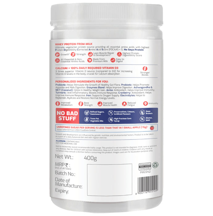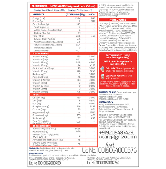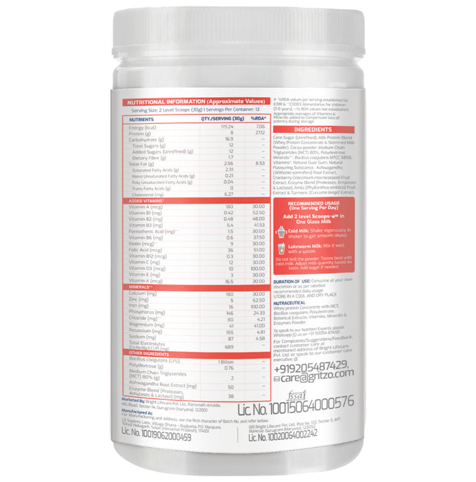 Gritzo Super Milk Girl Weight+ for 8-12 Years Double Chocolate provides optimal nutrition according to age, gender, and special needs. It is scientifically formulated, crafted after extensive research, and has undergone strict quality checks. Gritzo SuperMilk Weight+ for 8 to 12 Years girls promotes natural weight gain. This drink provides 8 g of high-quality whey protein per 30 g of serving to fulfil the daily protein gap.