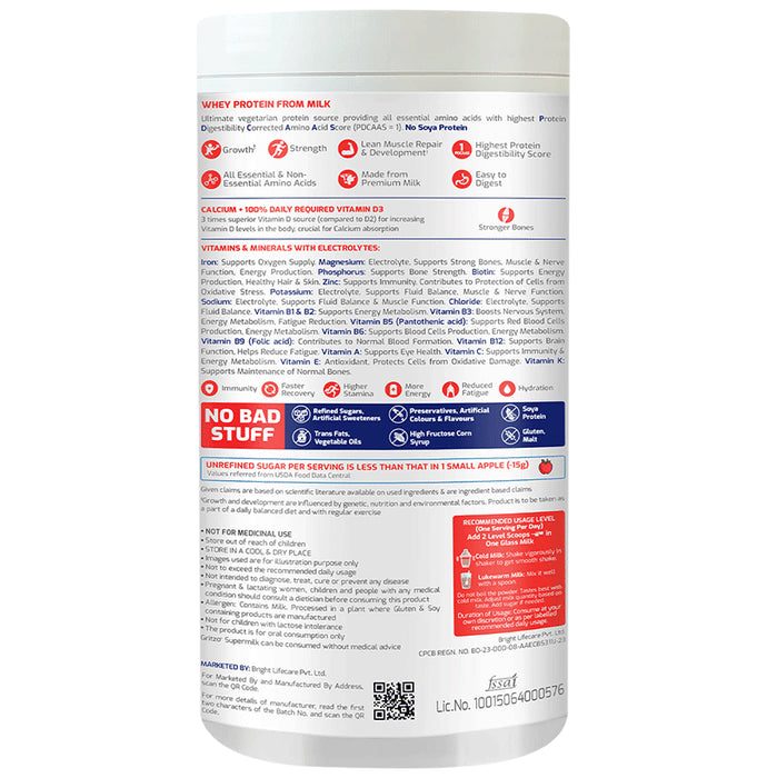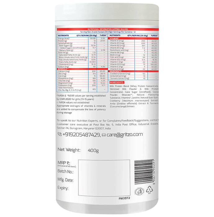 Gritzo SuperMilk Overall Growth (13+y Girls), 12g Protein (Double Chocolate, 400g) / Zero Refined Sugar, 21 Vitamins and Minerals is a nutritional supplement for girls that provides 12g protein per serving i.e. 24% more RDA protein than other protein drinks for kids. It contains high-quality protein that is fast-absorbing with the highest digestibility score (PDCAAS = 1). It provides 21 essential vitamins, minerals, and electrolytes. Keeping in mind the special needs of girls, it has turmeric, cranberry, and biotin for its antioxidant and anti-bacterial properties. This nutrition powder for kids also provides 100% RDA of Vitamin D3 and B9. This nutrition drink for girls is scientifically formulated to provide macro and micronutrients as per age, gender, and special needs. It is crafted after extensive research and strict quality checks to provide the absolute best nutrition to your teenager. Therefore, this nutrition drink for kids is free from gluten, malt, trans-fat, artificial colours, flavours, or refined sugar content. This vegetarian protein powder for kids is available in 100% natural double chocolate flavour.Note: Growth and development are influenced by genetic, nutrition and environmental factors. Product is to be taken as a part of a daily balanced diet and with regular exercise.