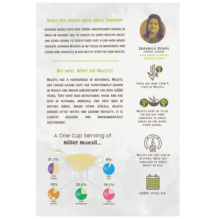 Gud Mom Millet MuesliIndulge in a morning of nutrient-dense goodness with the premium millet muesli. Packed with whole grains, millets, nuts, seeds, and dried fruits, this breakfast blend ensures a sustained energy boost to kickstart your day. Revel in the delicious harmony of crunchy nuts and chewy dried fruits, offering a balanced and delightful combination of flavours. Gluten-free millets provide essential vitamins, minerals, and fibre, promoting digestive health. Opt for a healthier choice that's not only good for you but also environmentally conscious, as the millets are sustainably sourced. Elevate your mornings with this delicious and wholesome breakfast option.