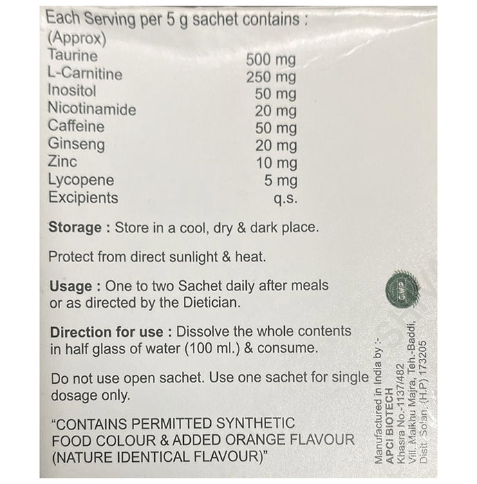 Composition : Taurine,L-Carnitine,Inositol,Nicotinamide,Caffeine,Ginseng,Zinc,Lycopene