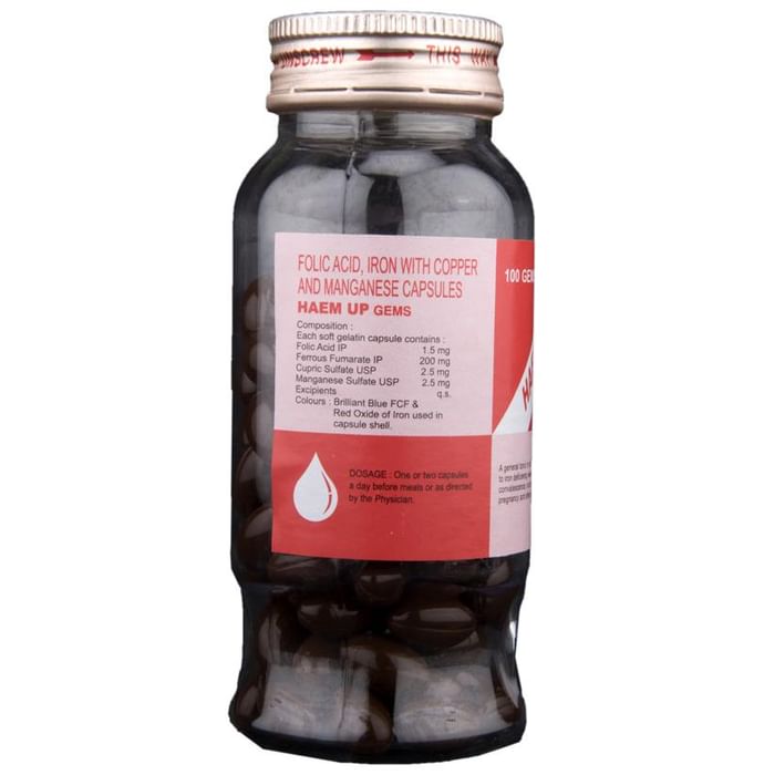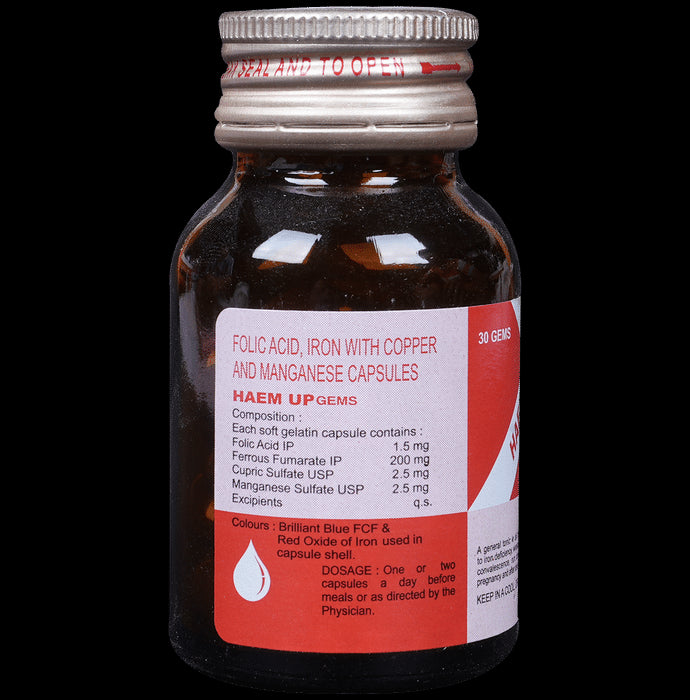 Haem UP Gems Capsule contains iron, folic acid, manganese, and copper. Is helps manage all types of anaemia due to iron deficiency, weakness, and lack of appetite. It is suitable during pregnancy and after delivery. It is essential during periods of rapid cell division and growth. Both children and adults require folic acid to produce healthy red blood cells and prevent anaemia. Copper and manganese are essential for healthy bones, nerves, and muscles.