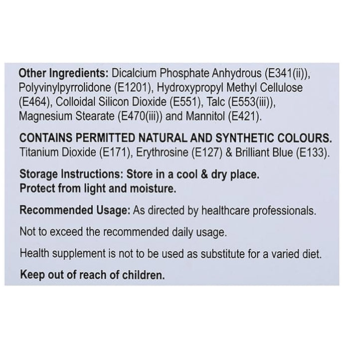 Composition : Ferrous Ascorbate(SR), L-Methylfolate, Methylcobalamin, Biotin, Cholecalciferol, Pyridoxal-5-Phosphate, L-leucine, L-arginine, Dicalcium Phosphate Anhydrous, Polyvinylpyrrolidone, Colloidal Silicon Dioxide, Hydoxy Propyl Methyl Cellulose, Talc, Mannitol, Magnesium Stearate