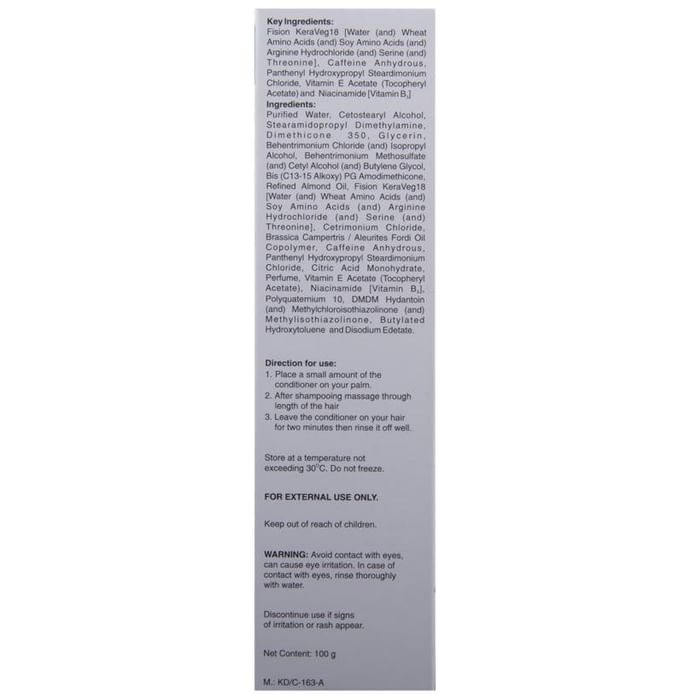Composition : Fision KeraVeg18 [Water (and) Wheat Amino Acids (and) Soy Amino Acids (and) Arginine Hydrochloride (and) Serine (and) Threonine], Caffeine Anhydrous, Panthenyl Hydroxypropyl Steardimonium Chloride, Vitamin E Acetate (Tocopheryl Acetate) and Niacinamide [Vitamin B1], Cetostearyl Alcohol, Stearamidopropyl Dimethylamine, Dimethicone 350, Glycerin, Behentrimonium Chloride (and) Isopropyl Alcohol, Behentrimonium Methosulfate (and) Cetyl Alcohol (and) Butylene Glycol, Bis (C13-15 Alkoxy) PG Amodimethicone, Refined Almond Oil, Cetrimonium Chloride, Brassica Campertris/Aleurites Fordi Oil Copolymer, Citric Acid Monohydrate, Perfume, Polyquaternium 10, DMDM Hydantoin, Methylchloroisothiazolinone, Methylisothiazolinone, Butylated Hydroxytoluene and Disodium Edetate.