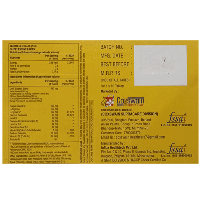 Composition : DHT Blocker Blend, Grape Seed Extract, Calcium Pantothenate, L-Arginine, L-Cysteine, Ferrous Fumarate, Inositol, Gamma Linolenic Acid (GLA), Licorice, Gotu Kola, Biotin, Selenium