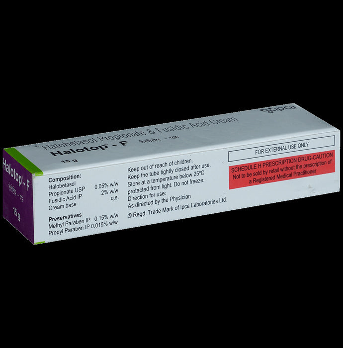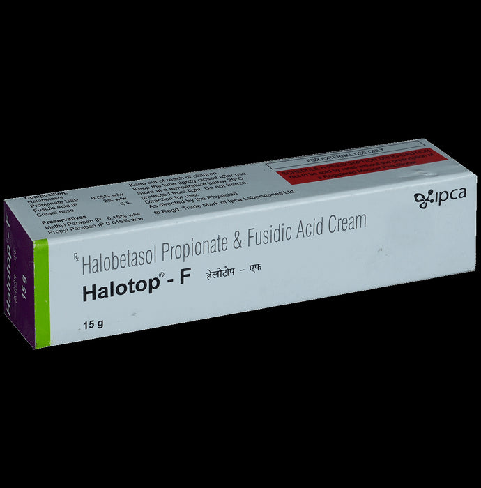 Halotop-F Cream is a combination of two medicines: Halobetasol and Fusidic Acid which treat skin infections. Halobetasol is a steroid which blocks the production of certain chemical messengers (prostaglandins) that make the skin red, swollen and itchy. Fusidic Acid is an antibiotic which kills bacteria by preventing the synthesis of essential proteins required by bacteria to carry out vital functions.