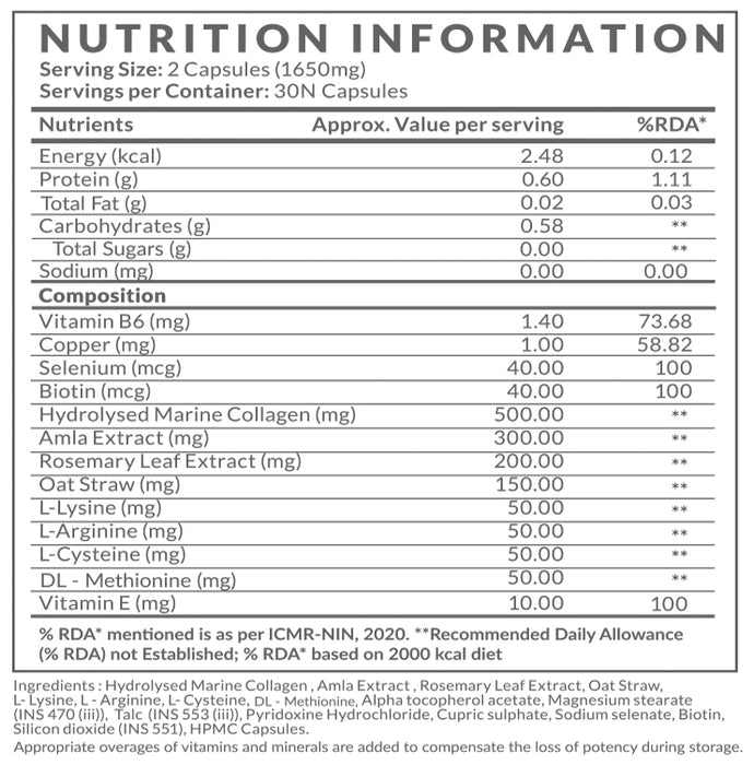 Composition : L-Arginine, Vitamin E, Vitamin B6, Copper, Selenium, Biotin, Amla Extract, Rosemary Leaf Extract, L-Cysteine, Hydrolysed Marine Collagen