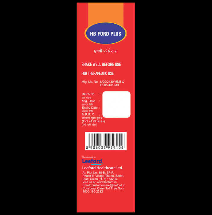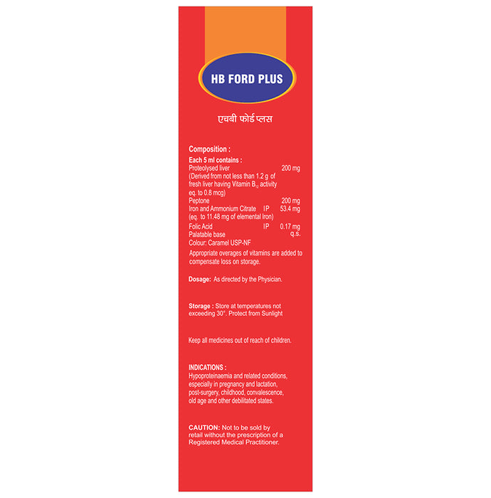 HB Ford Plus Syrup contains hydrolysed proteins, iron, vitamin B12 and folic acid. HB ford plus syrup is indicated in hypoproteinemia (condition in which a person has very low levels of protein in the blood) and related Iron deficiency especially in pregnancy and lactation, Iron deficiency anaemia, post-surgical cases.