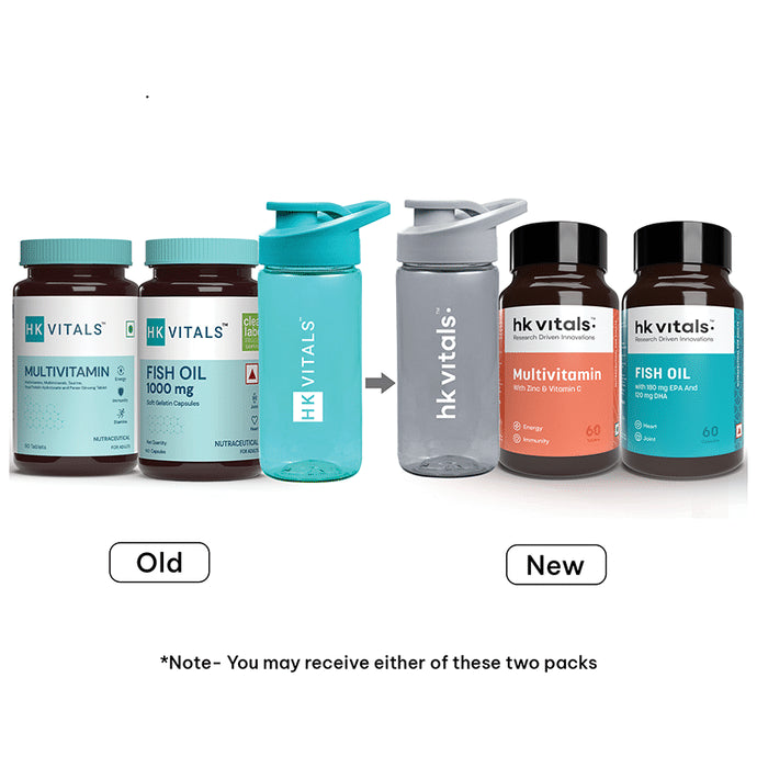 Healthkart Combo Pack of Multivitamin Film Coated Tablet & Fish Oil 1000mg Soft Gelatin Capsule Helps to support the immunity system of the bodyHealthKart HK Vitals Multivitamin for men and women is a comprehensive multivitamin & minerals with the goodness of Ginseng extract & Taurine along with 9 essential amino acids that fulfil the micronutrient gaps in the everyday diet to support an active and fit lifestyle. The blend of vitamins, minerals, amino acids, and herbs helps promote overall well-being. Ginseng and taurine can help reduce stress, increase mental awareness, improve mood, and revitalise the body. Vitamin D3 and magnesium help enhance bone health. Vitamin C is an antioxidant that boosts immunity.