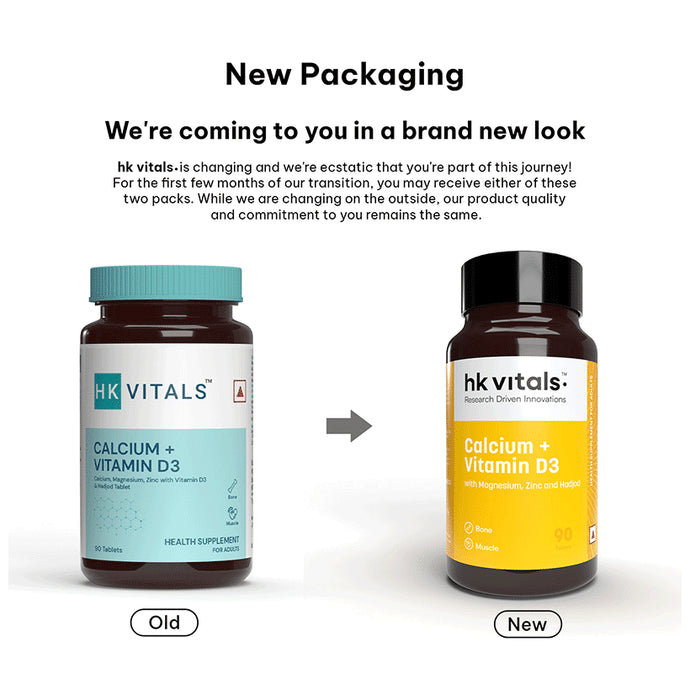 Healthkart HK Vitals Calcium + Vitamin D3 Tablet Calcium benefits the body in several ways, most notably for maintaining strong bones & muscle strength. Diets often fall short of the recommended daily calcium intake, particularly in individuals with higher needs, such as older adults and postmenopausal women. Besides, vegetarian diets contain lower amounts of calcium. Poor calcium and Vitamin D intake may lead to weak and porous bones (osteoporosis) that affect bone and joint health. To avoid calcium deficiency in the body, calcium supplements are required. HK Vitals Calcium + Vitamin D3 (from the house of HealthKart) is a comprehensive nutritional supplement of a highly bioavailable form of calcium (Calcium Citrate Malate) & Vitamin D3 with the goodness of magnesium, zinc, & hadjod that helps maintain your bone and joints strong and healthy.
