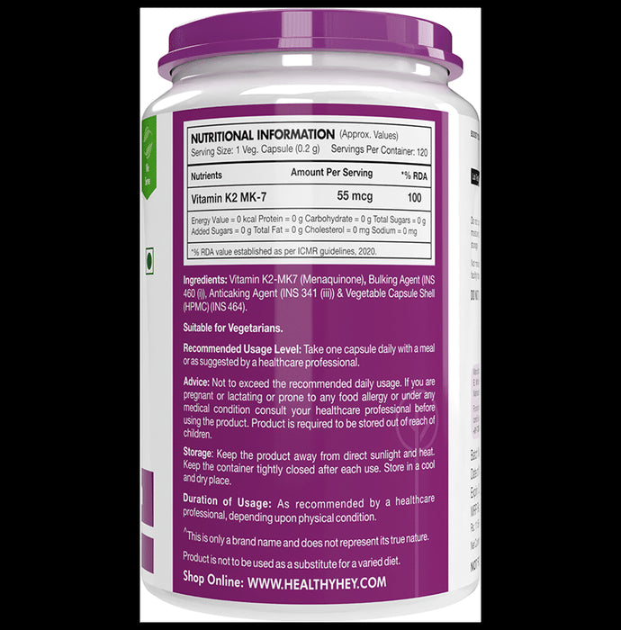 HealthyHey Vitamin K2 MK 7 Vegetable Capsule is a dietary supplement consisting of vitamin K2, a group of fat-soluble compounds essential for blood coagulation and calcium binding in bone and other tissues. MK-7 helps increase bone mineral density and promotes bone quality and strength. The vitamin K2 in this supplement is derived from the same microorganism present in natto food and plays an important role in bone health.