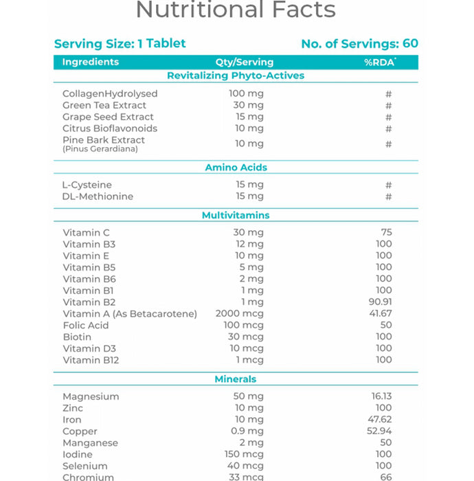 Composition : Revitalizing Phyto-Actives: Collagen Hydrolysed, Green Tea Extract, Grape Seed Extract, Citrus Bioflavonoids, Pine Bark Extract (Pinus Girardin),Amino Acid: L-Cysteine, DL-Methionine,Multivitamins: Vitamin C (Ascorbic Acid), Vitamin B3 (Niacinamide), Vitamin E, Vitamin B5 (Calcium Pantothenate), Vitamin B6, Vitamin B1, Vitamin B2, Vitamin A (As Beta-carotene), Folic Acid, Vitamin B7 (Biotin), Vitamin D3, Vitamin B12,Minerals: Magnesium, Zinc, Iron, Copper, Manganese, Iodine, Selenium, Chromium