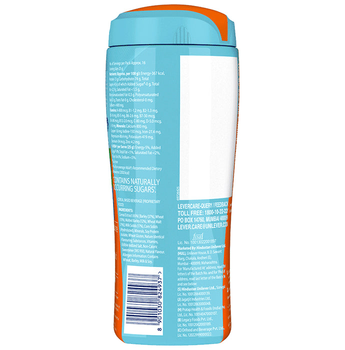 Composition : Cereal Extract, Barley, Wheat, Malted Barley, Wheat Malt, Milk Solids, Corn Solids (hydrolysed), Minerals, Soy Protein Isolate, Wheat Gluten, Vitamins, Salt, Artificial Sweetener, Natural Flavour, Monounsaturated fatty acids, Polyunsaturated fatty acids, Trans fatty acids, Sugar, Vitamins A, B1, B2, B6, B12, C, E, K, D2, Niacin, Pantothenic acid, Biotin, Folic acid, Choline, Sodium, Potassium chloride, Calcium, Phosphorus, Magnesium, Iron, Zinc, Manganese, Copper, Iodine, Selenium, Molybdenum