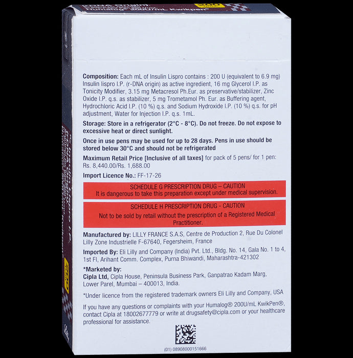 Humalog 200IU/ml Kwikpen is used to improve blood sugar control in people with type 1 and type 2 diabetes mellitus. It’s a fast-acting type of insulin that helps to lower blood sugar levels after meals and reduce the chances of developing serious complications of diabetes. Humalog 200IU/ml Kwikpen is normally prescribed along with a long-acting type of insulin or other diabetes medicines. Your doctor or nurse will teach you the correct way of injecting it under the skin. It should be taken 15 minutes before a meal or within 20 minutes after starting a meal. Do not stop the medication unless your doctor tells you to. It is only part of a treatment program that should also include a healthy diet, regular exercise, and weight reduction as advised by your doctor.Check your blood sugar levels regularly, keep track of your results and share them with your doctor. This is very important to work out the correct dose of the medicine for you.The most common side effect of this medicine is hypoglycemia. To prevent this, it is important to always inject only the correct dose of medicine, monitor your blood sugar levels regularly, and have regular meals. Drinking excessive alcohol can also lead to a fall in your blood sugar levels. Other side effects include allergy at the injection site like redness, swelling, or hard lumps (lipodystrophy). Some people can also gain weight while taking insulin.Do not use this medicine when you have low blood sugar levels (hypoglycemia). Tell your doctor if you have ever had kidney, liver, or heart problems before starting treatment. Pregnant or breastfeeding women should also consult their doctor as the dose may need to be changed.