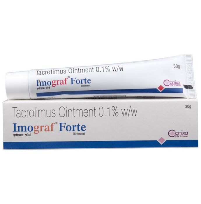 Imograf Forte Ointment is used to treat eczema (atopic dermatitis). It works by suppressing the activity of certain immune cells that cause inflammation (redness and swelling) of the skin. This relieves itching and improves rashes in atopic dermatitis.Imograf Forte Ointment is used for external use. It should be used 2-4 times a day on the affected area or use it as suggested by the doctor. It should be applied slowly and evenly to the skin until it is rubbed in. You should not use it too often and you should not cover the treated area with a bandage or plaster. You must inform your doctor if there’s no improvement even after two weeks of treatment or if the skin gets worse.Use of this medicine may cause some common side effects like erythema, headache, inflammation of hair follicle, and application site reaction like burning, irritation, itching, and redness. This medicine is not normally recommended during pregnancy or while breastfeeding unless it is clearly needed.