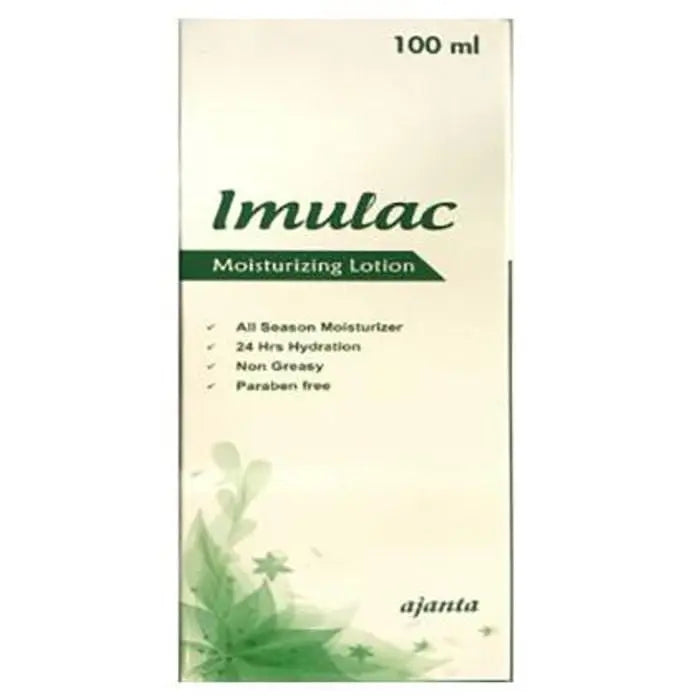 Imulac Lotion contains the goodness of herbs with antiseptic properties and a moisturising cream with long-lasting protection. It is designed for mild scratches, blisters, bites from mosquitoes, chilblains, sunburns, nappy rashes, dried and broken eyes, and itchy skin and is ideal for all forms of skin. Ingredients: As mentioned on the label Benefits: It contains the goodness of herbs with antiseptic properties and a moisturising cream with long-lasting protection|It is designed for mild scratches, blisters, bites from mosquitoes, chilblains, sunburns, nappy rashes, dried and broken eyes, and itchy skin and is ideal for all forms of skin|It is non-greasy and paraben free|It gives 24 hrs moisturisation Direction of use: Use as directed on the label or as suggested by health care professionals. Uses: Keeps your skin healthy|Gives 24 hrs moisturisation|Non-greasy and paraben free
