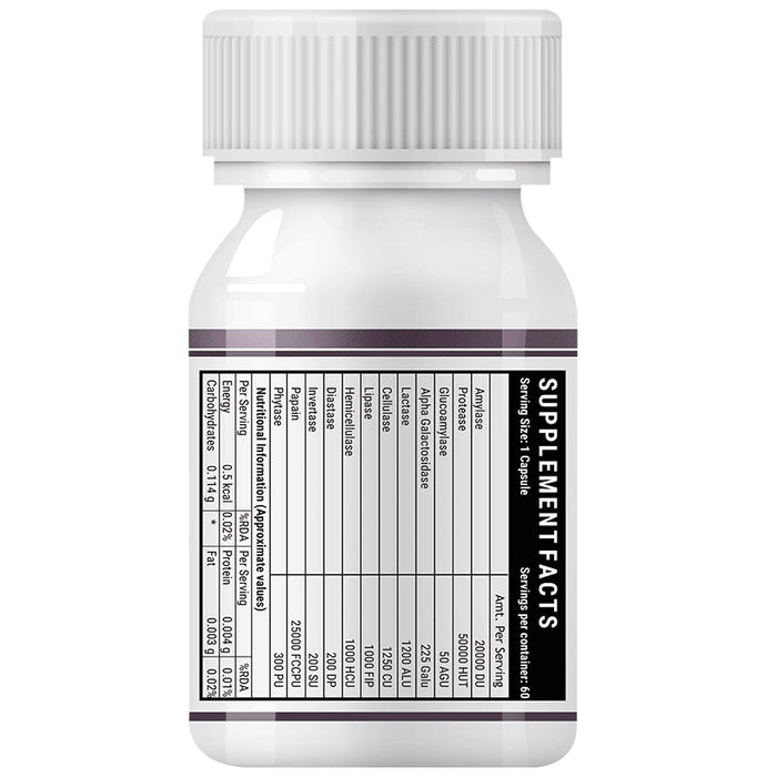 Composition : Amylase,Papain,Lactase,Hemicelluase,Protease,Glucoamylase,Alpha galactosidase,Cellulase (capsule),Silicon dioxide (INS 551),Diastase,Phytase