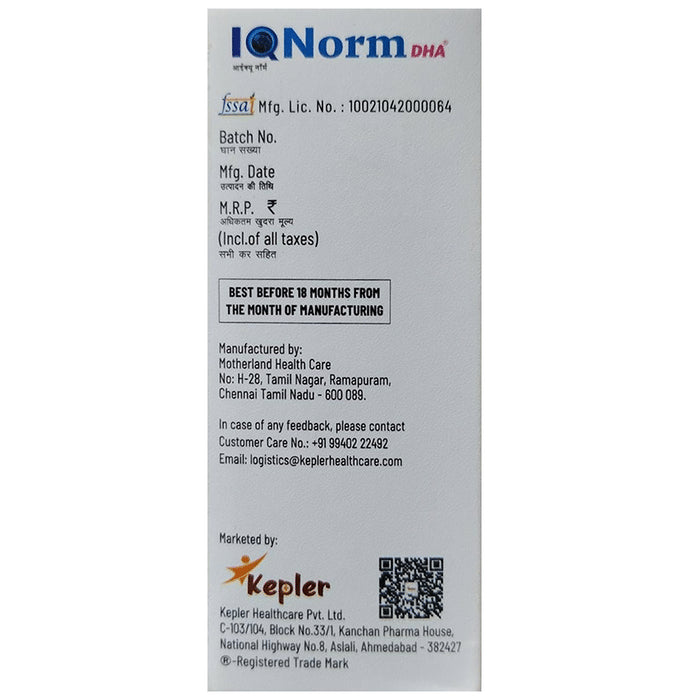 Iqnorm DHA Syrup is a supplement enriched with omega-3 fatty acids, particularly Eicosapentaenoic Acid (EPA) and Docosahexaenoic Acid (DHA). EPA and DHA are renowned for their anti-inflammatory properties, helping in the reduction of inflammation throughout the body, which is crucial for reducing the risk of various chronic diseases. Moreover, DHA is particularly vital for brain health, supporting cognitive function, and overall neurological health. This syrup offers a convenient and effective way to ensure an adequate intake of these crucial nutrients, especially for individuals who may not consume sufficient amounts through their regular diet.
