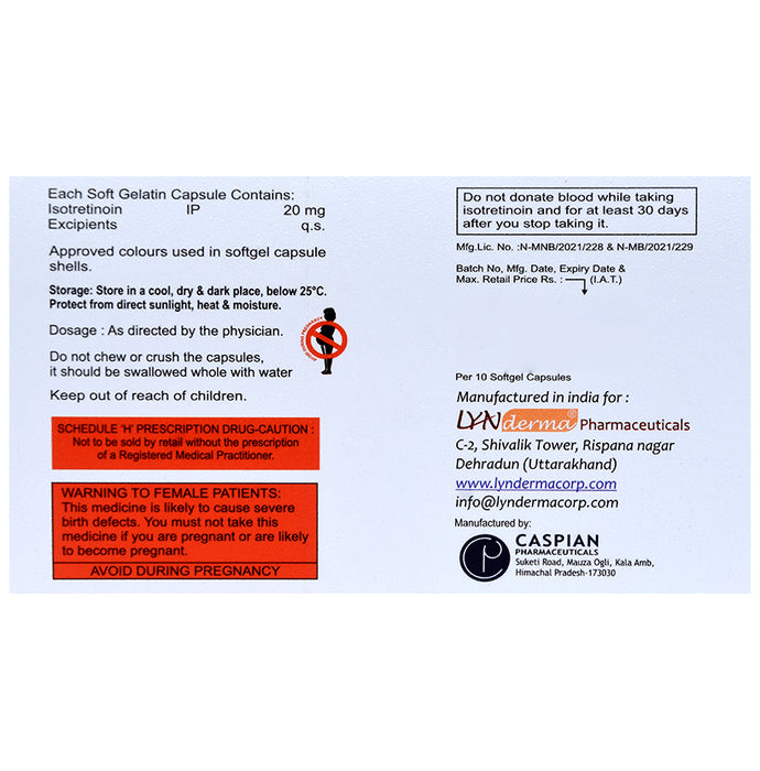 Isek 20 Capsule belongs to a group of medicines called retinoids (vitamin A derivative). It is used to treat severe acne that has not responded to other treatments. Isek 20 Capsule should be used in the dose and duration as advised by your doctor. Take it with food, preferably at the same time each day to avoid a missed dose. It may take several weeks for your symptoms to improve but keep taking the medicine regularly to get the most benefit. If you notice no improvement after a few weeks, see your doctor again.The most common side effects include dry skin, rash, and increased liver enzymes. They are not usually serious and often disappear after getting used to the medicine but if they bother you or do not go away, tell your doctor.Isek 20 Capsule may make you more sensitive to sunlight so you should limit your exposure to the sun. It may also make your skin more fragile. Avoid any waxing (hair removal), or laser treatments during treatment. Additionally, it may cause dryness of the mouth, lips, and eyes so drink plenty of water and use a moisturizer. This medicine may lead to birth defects, do consult your doctor if you are pregnant or planning pregnancy.