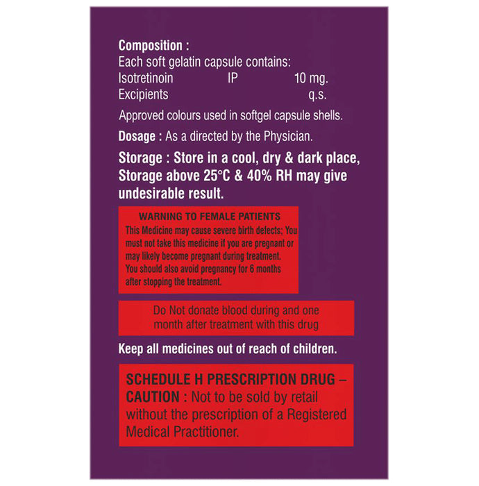 Isoblink 10 Softgel Capsule belongs to a group of medicines called retinoids (vitamin A derivative). It is used to treat severe acne that has not responded to other treatments.Isoblink 10 Softgel Capsule should be used in the dose and duration as advised by your doctor. Take it with food, preferably at the same time each day to avoid a missed dose. It may take several weeks for your symptoms to improve but keep taking the medicine regularly to get the most benefit. If you notice no improvement after a few weeks, see your doctor again.The most common side effects include dry skin, rash, and increased liver enzymes. They are not usually serious and often disappear after getting used to the medicine but if they bother you or do not go away, tell your doctor.Isoblink 10 Softgel Capsule may make you more sensitive to sunlight so you should limit your exposure to the sun. It may also make your skin more fragile. Avoid any waxing (hair removal), or laser treatments during treatment. Additionally, it may cause dryness of the mouth, lips, and eyes so drink plenty of water and use a moisturizer. This medicine may lead to birth defects, do consult your doctor if you are pregnant or planning pregnancy.