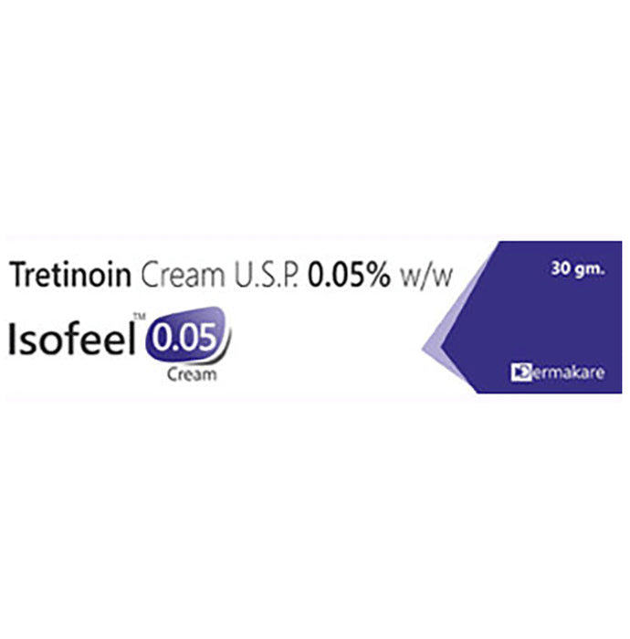 Isofeel 0.05 Cream is a form of vitamin A that is used to treat acne which appears as spots or pimples on your face, chest, or back. It also helps to smooth rough facial skin and to reduce fine wrinkles on the skin. Isofeel 0.05 Cream reduces excessive oil production of the skin. Ideally, a pinpoint application at nighttime is recommended for the duration prescribed by your doctor. The amount you need and for how long you need to take it will depend on what you are being treated for. You should normally wash and dry the affected area before applying a thin layer of this medicine. Follow your doctor’s instructions. You should not apply it to damaged or broken skin and avoid contact with your mouth, eyes, and nose. It may take several weeks for your symptoms to improve but keep using it regularly to get the most benefit. Consult your doctor again if you do not notice any improvement after a few weeks. Using more medicine or applying it more often than prescribed will not make it work any faster and may increase the side effects.The most common side effects include irritation, dryness, and redness of the skin. They are usually mild and improve as your body gets used to the medicine. Drink plenty of water and use moisturizer as it may lead to dryness of the mouth, lips, and eyes. Let your doctor know if these side effects bother you or do not go away. Serious side effects with this medicine are rare.This medicine may make you more sensitive to sunlight so you should limit exposure to the sun if possible. It may make your skin more fragile. It is advised, not to have any waxing (hair removal), or laser treatments during treatment. Pregnant women or women who are planning to get pregnant should not use this medicine as it can lead to birth defects.