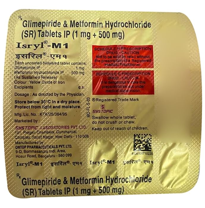 Isryl-M1 Tablet SR belongs to a category of medicines known as anti-diabetic drugs. It is a combination of two medicines used to treat type 2 diabetes mellitus in adults. It helps control blood sugar levels in people with diabetes. Isryl-M1 Tablet SR should be taken with food. Take it regularly at the same time each day to get the most benefit. Your doctor will decide what dose is best for you and this may change from time to time according to how it is working according to your blood sugar levels.Keep taking this medicine, even if you feel well or your blood sugar levels are controlled. If you stop it without consulting your doctor, your blood sugar levels could rise and put you at risk of kidney damage, blindness, nerve problems, and loss of limbs. Remember that it is only part of a treatment program that should also include a healthy diet, regular exercise, and weight reduction as advised by your doctor. Your lifestyle plays a big part in controlling diabetes.The most common side effect of Isryl-M1 Tablet SR is low blood glucose levels (hypoglycemia). Make sure you recognize the signs of having low blood glucose levels, such as sweating, dizziness, headache, and shaking, and know how to deal with it. To prevent this, it's important to have regular meals and always carry a fast-acting source of glucose such as sugary food or fruit juice with you. Drinking alcohol can also increase your risk of low blood sugar levels and should be avoided. Other side effects that may be seen on taking this medicine include taste changes, nausea, diarrhea, stomach pain, headache, and upper respiratory tract infection. Some people may find that they put on weight with this medicine.You should not take it if you have type 1 diabetes mellitus, if you have diabetic ketoacidosis (high levels of acid in your blood), or if you have severe kidney or liver disease. Before taking this medicine, tell your doctor if you have ever had heart disease. It may not be suitable. Pregnant or breastfeeding women should also consult their doctor before taking it. Your blood sugar levels should be checked regularly and your doctor may also advise blood tests to monitor your blood cell counts and liver function.
