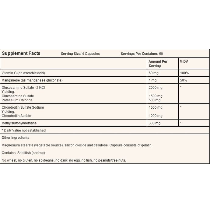 Composition : Vitamin C (as Ascorbic Acid), Manganese (as Manganese Citrate), Sodium (as Chondroitin Sulfate Sodium), Potassium (as Glucosamine Sulfate • 2 KCl), Glucosamine Sulfate (from 2,000 mg Glucosamine Sulfate • 2 KCl), Chondroitin Sulfate (from 1,440 mg Chondroitin Sulfate Sodium), Methylsulfonylmethane, Capsule (bovine gelatin), microcrystalline cellulose, magnesium stearate (vegetable source) and silicon dioxide