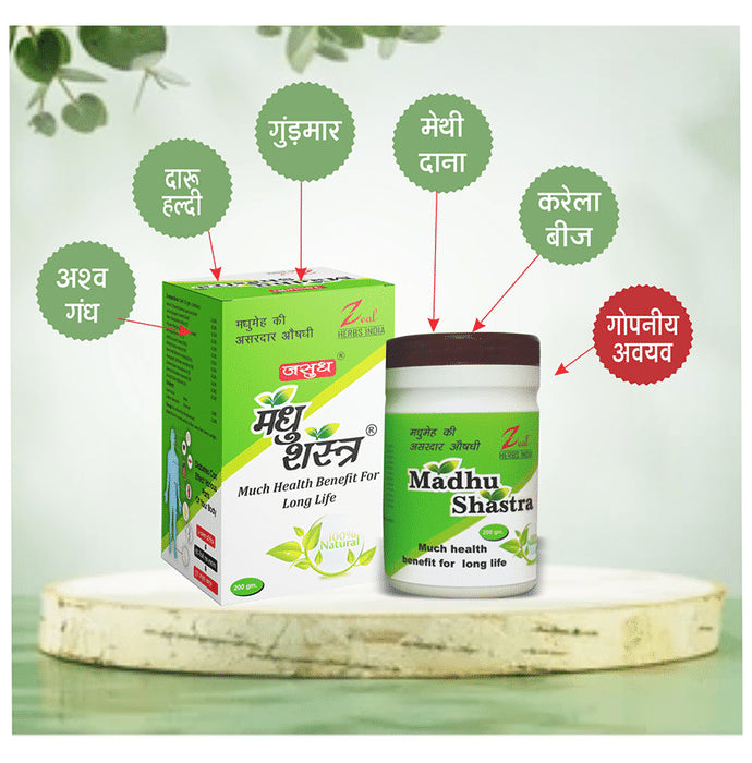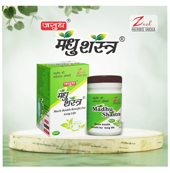 Jasudh Madhu Shastra Granules is a herbal concoction that helps break down the build-up of excessive sugar in your blood and promotes a healthier lifestyle. It is a delicious blend of jamun, karela, bel, babool, daru haldi and guduchi (Giloy) and is free of any added sugar or flavour. It is safe for everyone and free of any added flavour, seeds or impurities. Its key ingredients are jamun, karela and guduchi, ashwagandha, bel, babool, and some secret ingredients which are pure ayurvedic herbs that help to boost immunity and control blood sugar.