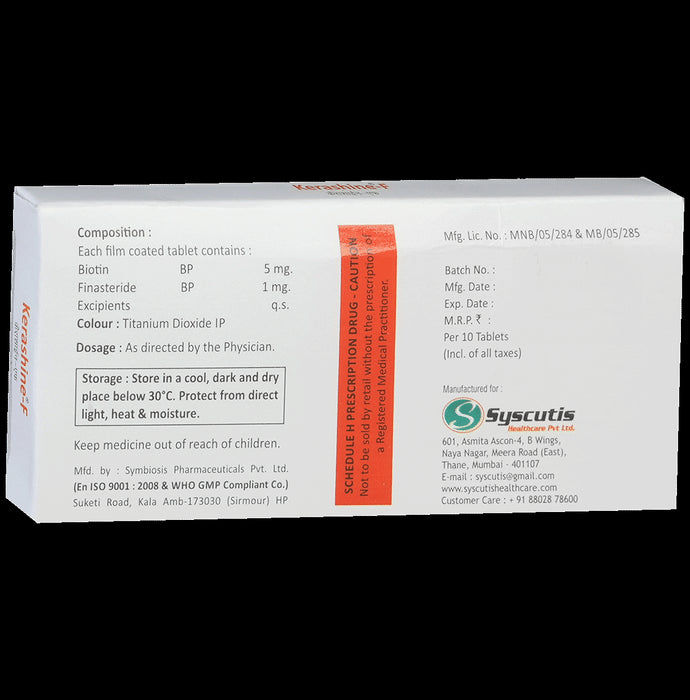 Kerashine-F Tablet is a combination of two medicines used in the treatment of hair loss. It provides nutrition to promote hair growth and inhibits the production of the hormone responsible for hair loss. It may also be used for other medical conditions and disorders. Kerashine-F Tablet can be taken with or without food. The dose and duration of the medicine should be taken as per prescription. An overdose of it may cause harm to your health. It is better to take the medicine at the same time each day and it must be swallowed as a whole. It may take some time for the medicine to be effective. The course of the treatment should be completed for better efficacy of the medicine.Use of this medicine may cause a few common side effects such as ejaculation disorder, impotence, and low sexual desire. Some people may also experience allergic reactions such as itching, rashes, and swelling of the lips or face. If you experience any of these side effects, consult your doctor without delay.This medicine may not be suitable for everybody. Before using the medicine, you should let your doctor know if you have any problems with your heart, liver, or kidneys. Also, let your doctor know of all the other medicines you are taking.
