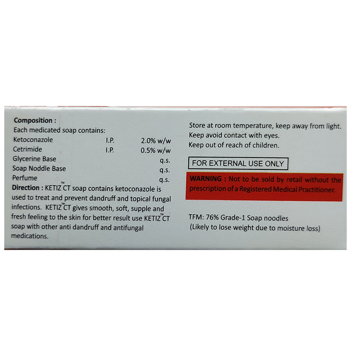 Ketiz CT Soap is a combination of two medicines: Cetrimide and Ketoconazole, which treats dandruff. Cetrimide is an antiseptic which kills bacteria, fungi and viruses on the scalp, and treats flaky and itchy scalp. Ketoconazole is an antifungal. It works by stopping the growth of dandruff-causing fungi by preventing them from forming their own protective covering.
