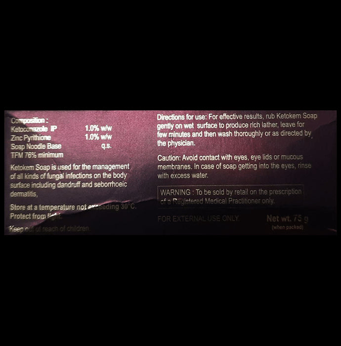 Ketokem Soap 75gm For Skin Infections is a combination of two antifungal medicines: Ketoconazole and Zinc pyrithione. It works by destroying the cell membrane of fungi that cause dandruff.