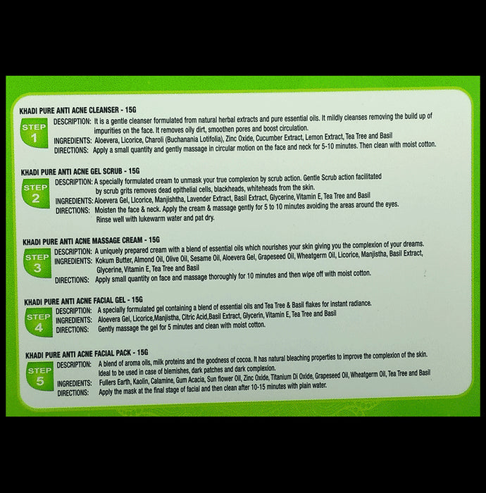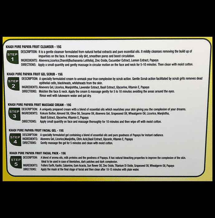 Composition : Papaya CleanserAloe vera, Licorice, Charoli (Buchanan Lotifolia), Zinc Oxide, Cucumber Extract, Lemon Extract, PapayaPapaya Gel ScrubAloe vera Gel, Licorice, Manjishtha, Lavender Extract, Basil Extract, Glycerine, Vitamin E, PapayaPapaya Massage CreamKokum Butter, Almond Oil, Olive Oil, Sesame Oil, Aloe vera Gel, Grapeseed Oil, Wheatgerm Oil, Licorice, Manjistha,Basil Extract, Glycerine, Vitamin E, PapayaPapaya Facial GelAloe vera Gel, Licorice, Manjistha, Citric Acid, Basil Extract, Glycerin, Vitamin E, PapayaPapaya Facial PackFullers Earth, Kaolin, Calamine, Gum Acacia, Sun Flower Oil, Zinc Oxide, Titanium Di Oxide, Grapeseed Oil, Wheatgerm Oil, PapayaKhadi Pure Anti Acne Mini Facial KitKey Ingredients:Anti-Acne CleanserAloe vera, Licorice, Charoli (Buchanania Lotifolia), Zinc Oxide, Cucumber Extract, Lemon Extract, Tea Tree and Basil Anti-Acne Gel ScrubAloe vera Gel, Licorice, Manjishtha, Lavender Extract, Basil Extract, Glycerine, Vitamin E, Tea Tree and Basil Anti-Acne Massage CreamKokum Butter, Almond Oil, Olive Oil, Sesame Oil, Aloe vera Gel, Grapeseed Oil, Wheatgerm Oil, Licorice, Manjistha, Basil Extract,Glycerine, Vitamin E, Tea Tree and Basil Anti-Acne Facial GelAloe vera Gel, Licorice, Manjistha, Citric Acid, Basil Extract, Glycerin, Vitamin E, Tea Tree and BasilAnti-Acne Facial PackFullers Earth, Kaolin, Calamine, Gum Acacia, Sunflower Oil, Zinc Oxide, Titanium Di Oxide, Grapeseed Oil, Wheatgerm Oil, Tea Tree and Basil Khadi Pure Papaya Mini Facial Kit