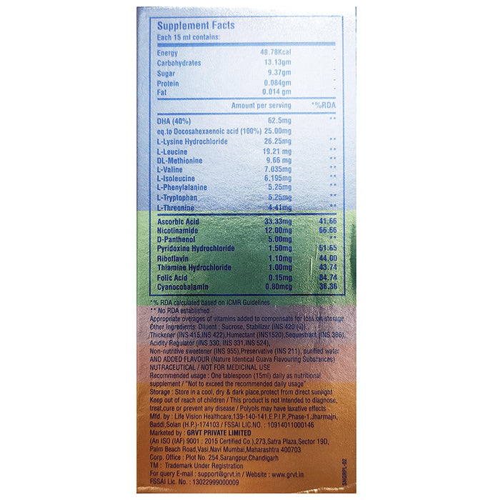 Composition : DHA Eq.To Docosahexaenoic acid (100%), L-Lysine Hydrochloride, L-Leucine, DL-Methionine, L-Valine, L-Isoleucine, L-Phenylalanine, L-Tryptophan, L-Threonine, Ascorbic Acid, Nicotinamide, D-Panthenol,Pyridoxine Hydrochloride, Riboflavin, Thiamine Hydrochloride, Folic Acid, Cyanocobalamin, Diluent, Sucrose, Stabilizer (INS 420 ()Thickener (INS 415,INS 422) Humectant (INS1520), Sequestract (INS 386), Acidity Regulator (INS 330, INS 331,INS 524),Non-nutritive sweetener (INS 955), Preservative (INS 211)