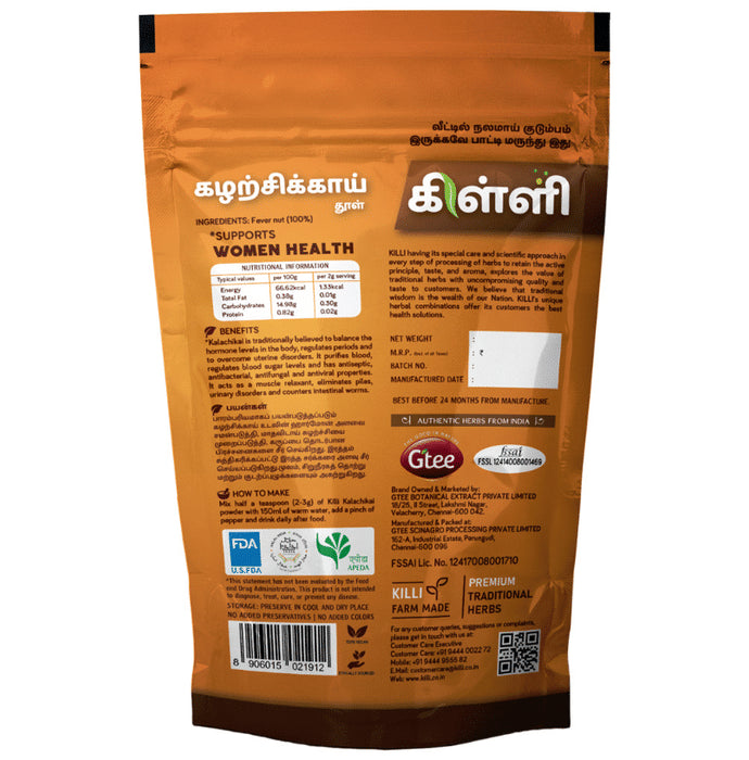 Killi Kalachikai Powder might help balance the hormone levels in the body, regulate the menstrual cycle and tries to overcome uterine disorders. It purifies blood, regulates blood sugar levels and has antibacterial, antiseptic, antifungal and antiviral properties. It acts as a muscle relaxant, eliminates piles, wounds, and urinary disorders and counters intestinal worms.