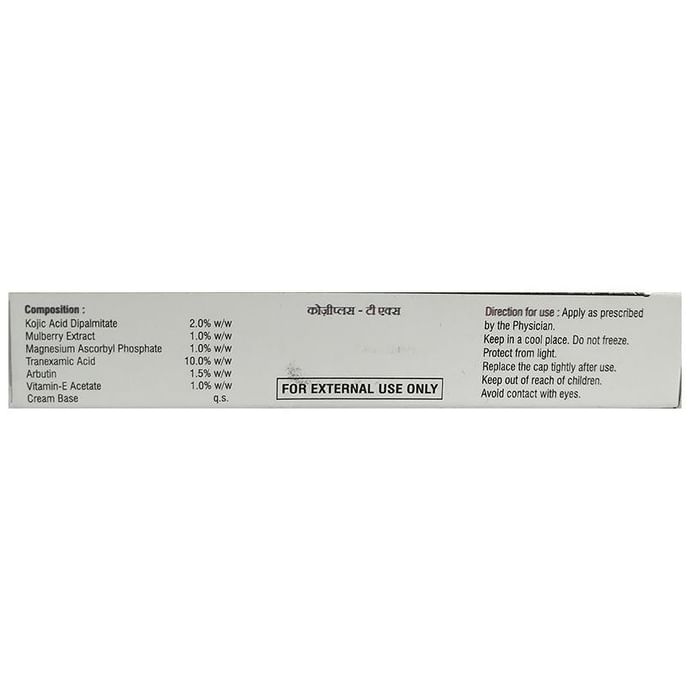 Kojiplus-TX Cream is a combination of six medicines. Tranexamic Acid is an anti-fibrinolytic. It protects the skin from UV radiation and reduces pigmentation. Kojic Acid is also an anti-pigmentation medicine. It works by suppressing the formation of melanin, a pigment that gives color to the skin. Arbutin is a natural skin lightening/whitening agent that reduces the production of melanin (skin pigment). Magnesium and Vitamin E provides essential nutrients. Mulberry extract is an antioxidant. It prevents premature aging and reduces wrinkles. This is how treats melasma.
