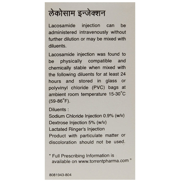 Lacosam Injection is use to control and prevent epilepsy (seizures). It is used alone or in combination with other similar medicines and it controls seizures by decreasing the abnormal and excessive activity of the nerve cells in the brain. Lacosam Injection is given under the supervision of a doctor or a nurse. It should not be self-administered at home. Get the injection regularly and at the same time each day to get maximum benefits. If you have missed a dose, take it as soon as you remember as it can be life-threatening in some cases, so it is better to keep an extra stock always to avoid a missed dose. You should finish the full course of treatment even if you feel better and always consult your doctor before stopping this medicine as it may increase seizure frequency. Inform your doctor if you have any heart-related problems, before starting your treatment with this medicine.The use of this medicine may cause some common side effects like headaches, dizziness, blurred vision, nausea, and diplopia (double vision). Most of these side effects are self-limiting and they usually improve with time. Additionally, you may notice some injection site reactions like redness or swelling. Please consult your doctor if these side effects do not resolve or persist for a longer duration.