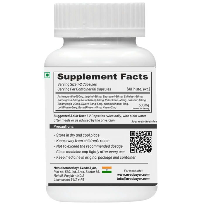 Composition : Macca root, horny goat weed, ashwagandha and shilajeet, and jaiphal.