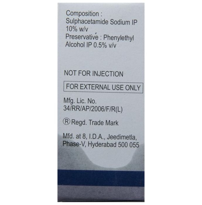 Locula 10% Eye Drop is an antibiotic used to treat bacterial infections of the eye. It fights the infection by stopping the growth of bacteria. This helps to cure the underlying infection. Locula 10% Eye Drop should be used as directed by your doctor. It should be used regularly at evenly spaced time intervals as prescribed by your doctor. Do not skip any doses and finish the full course of treatment even if you feel better. Stopping the medicine too early may lead to the infection returning or worsening.It is effective in killing many types of bacteria. However, it will not work for other types of eye infections (e.g., viral) and therefore, should only be used if prescribed by your doctor. Unnecessary use of any antibiotic can lead to a decrease in its effectiveness in the future.Commonly seen side effects seen with this medicine include temporary eye irritation and stinging in the eyes after administration. Consult your doctor if these side effects persist or if your condition worsens. Seek emergency medical help if you get a rash, itchy skin, swelling of face and mouth, or have difficulty breathing. Contact lenses should not be worn while you are using this medicine or while you have a bacterial eye infection.