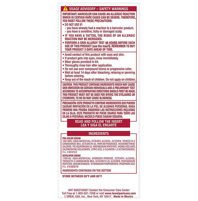Composition : Pre-colour serum:Aqua / Water / Eau, Cetearyl Alcohol, Propylene Glycol, Deceth-3, Laureth-12, Ammonium Hydroxide, Oleth-30, Hexadimethrine Chloride, Lauric Acid, Glycol Distearate, Polyquaternium-22, Ethanolamine, Silica Dimethyl Silylate, Parfum / Fragrance, Sodium Metabisulfite, Carbomer, Ascorbic Acid, Resorcinol, p-phenylenediamine, Edta, Ci 77891 / TITANIUM Dioxide, Threonine, Proline, m-aminophenol, 2,4-diamino phenoxyethanol HCL, DimethiconeDeveloper creme:Aqua / Water / Eau, Hydrogen Peroxide, Cetearyl Alcohol, Trideceth-2 Carboxamide Mea, Ceteareth-25, Glycerin, Phosphoric Acid, Tetrasodium Etidronate, Tetrasodium Pyrophosphate, Sodium Salicylate