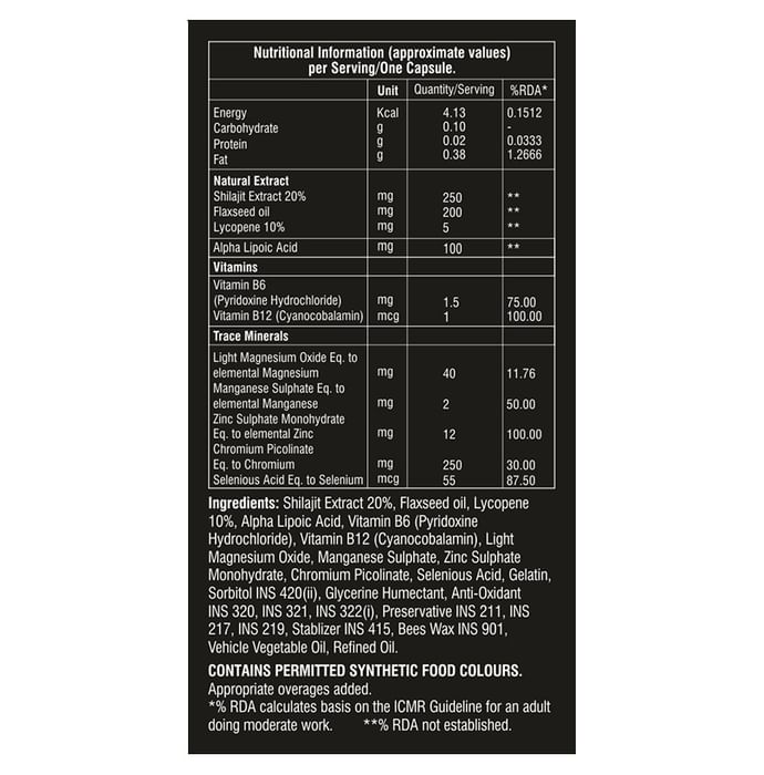 Composition : Shilajit extract 20%,Lycopene 10%,Flaxseed oil,Alpha-lipoic acid,Vitamin B12 (Cyanocobalamin),Vitamin B6 (Pyridoxine),Selenium,Chromium picolinate,Zinc,Manganese Sulphate,Light Magnesium Oxide