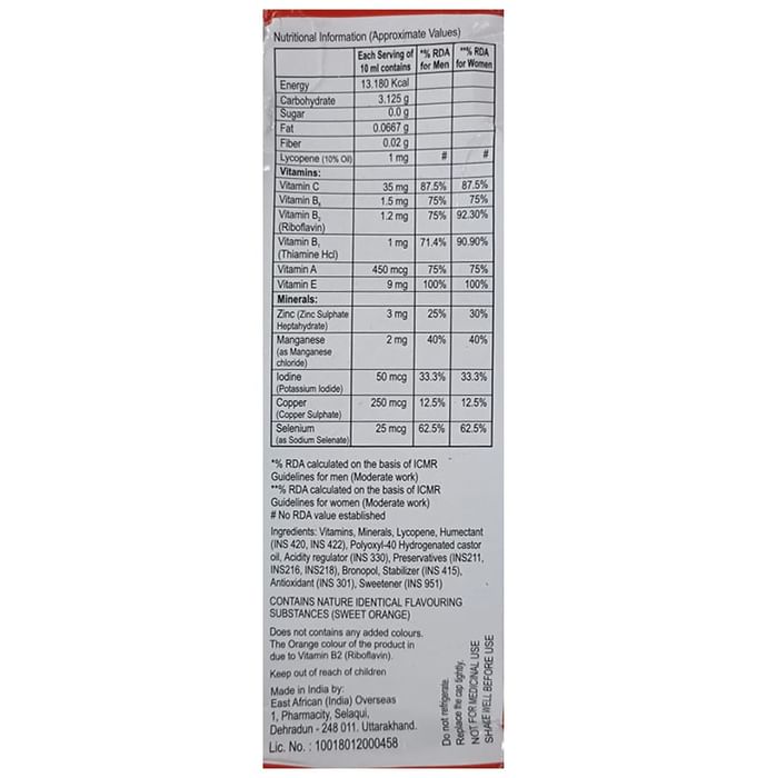 Lycofol syrup constitutes of Vitamin E, Ascorbic Acid, Vitamin A, Manganese, Lycopene , Selenium, Iodine, Copper , Elemental Zinc. Vitamin E are substances that protect cells from damage. Lycopene provides a full complement of tomato carotenoids and other nutrients to benefit good health. The synergy of the natural tomato lycopene, phytoene, phytofluene, beta-carotene, phytosterols, and vitamin E results in enhanced activity and this means greater health benefits. Other phytonutrients in Lycofol syrup act as major antioxidants.Vitamin A, Vitamin C (Ascorbic acid) & Vitamin E have been added in Lycofol syrup because they act as supportive antioxidant vitamins, thereby increasing the efficacy of the product. Selenium and Zinc Sulphate have been added in Lycofol syrup because they are important constituents of natural antioxidant enzymes found in the body.Use under medical supervision