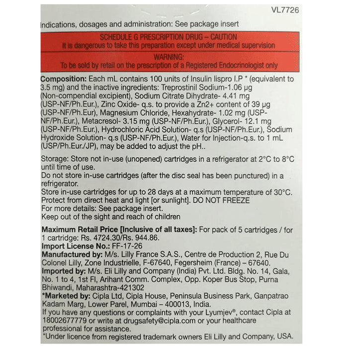 Composition : Insulin Lispro (100units)